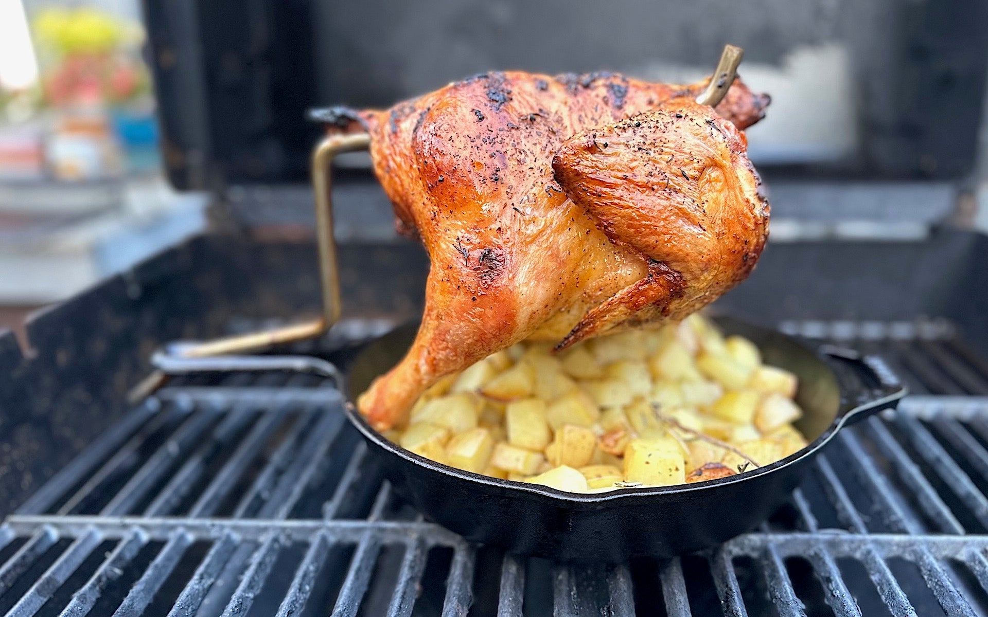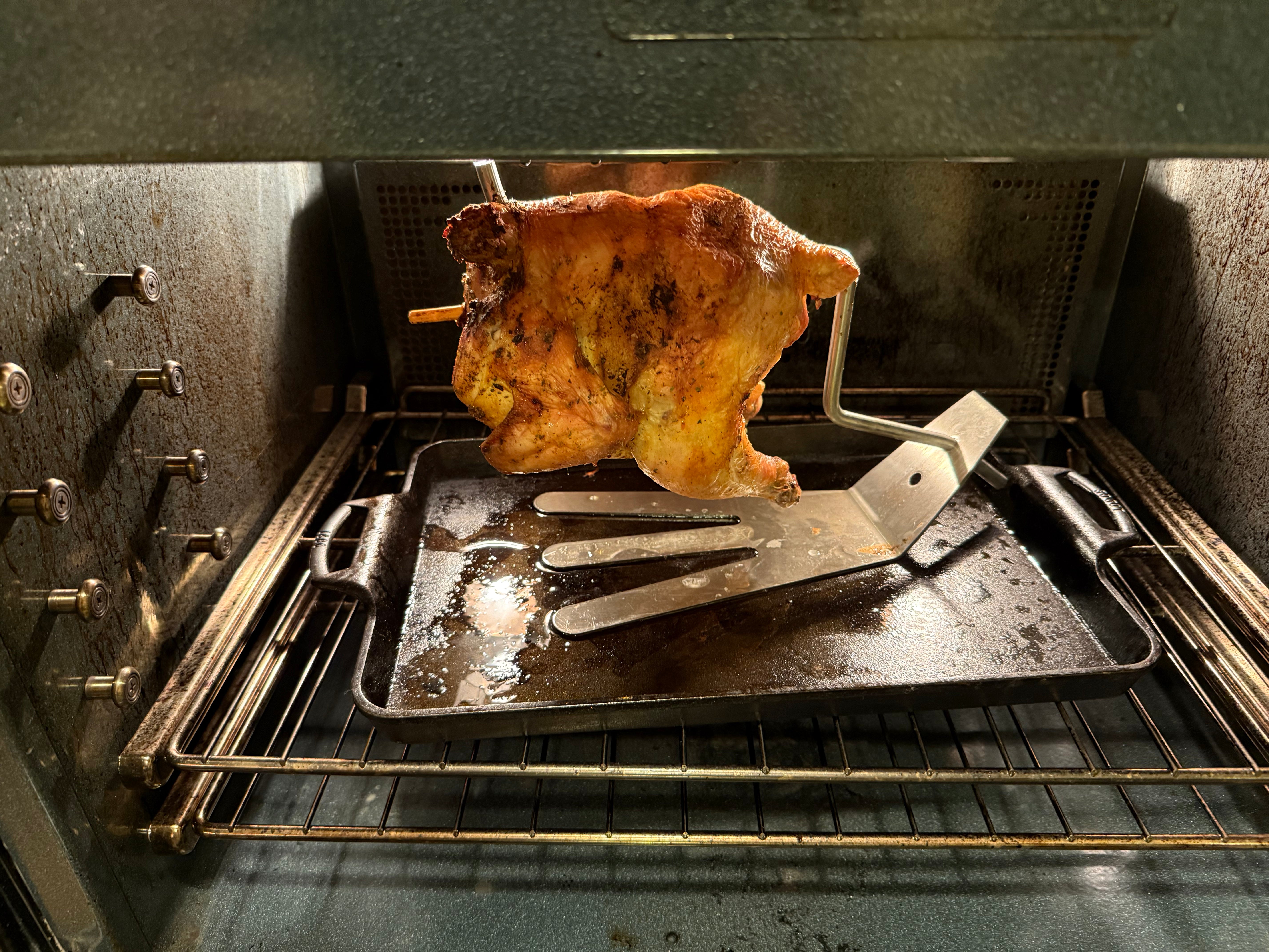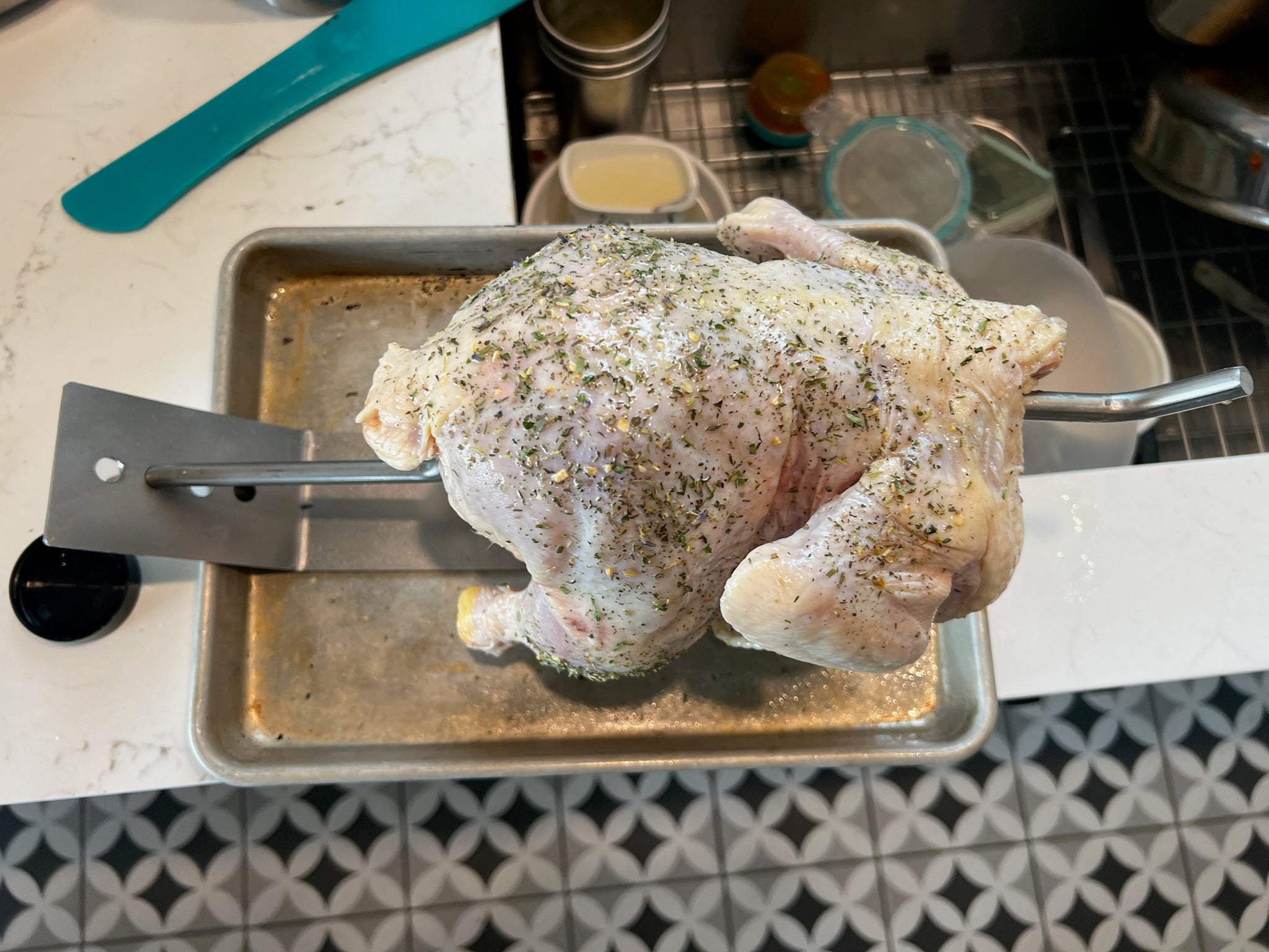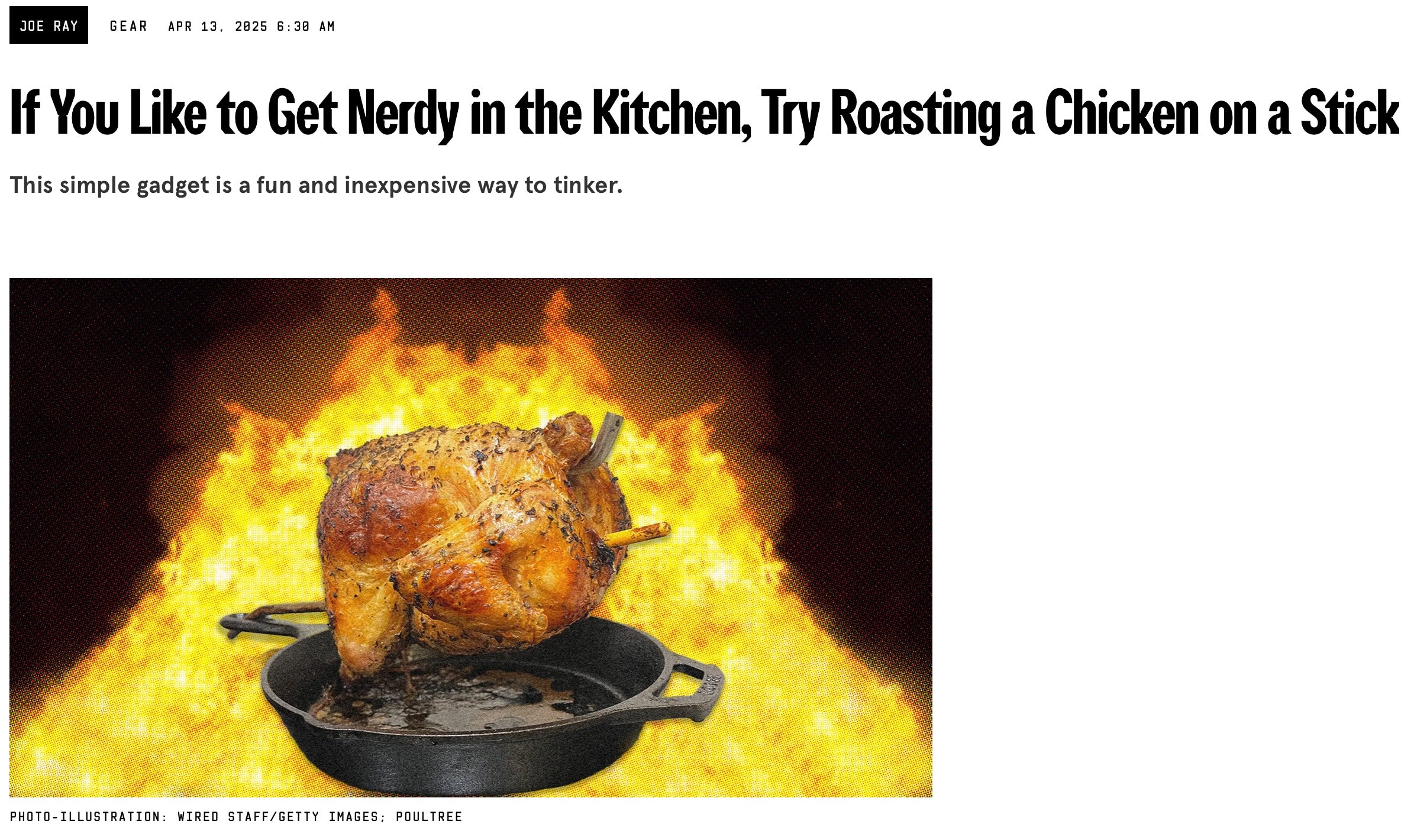 There’s no rotisserie spinning the chicken in circles, no associated app managing the time or temperature of another expensive kitchen gadget. It’s just a $20 rod, a pan, high heat from a grill or oven, ...