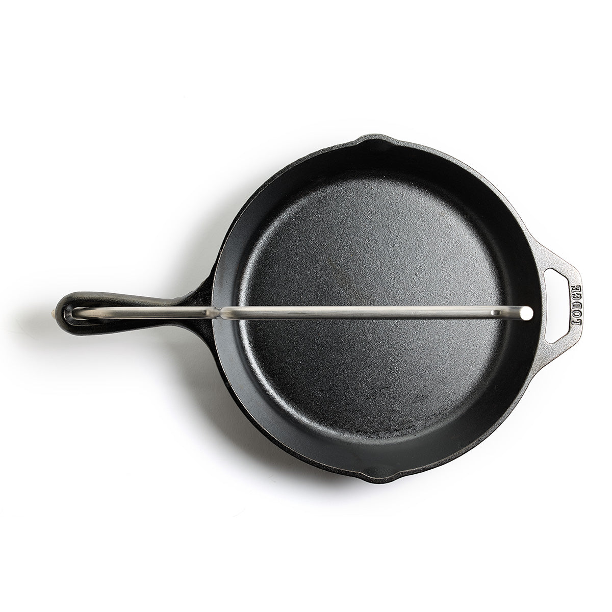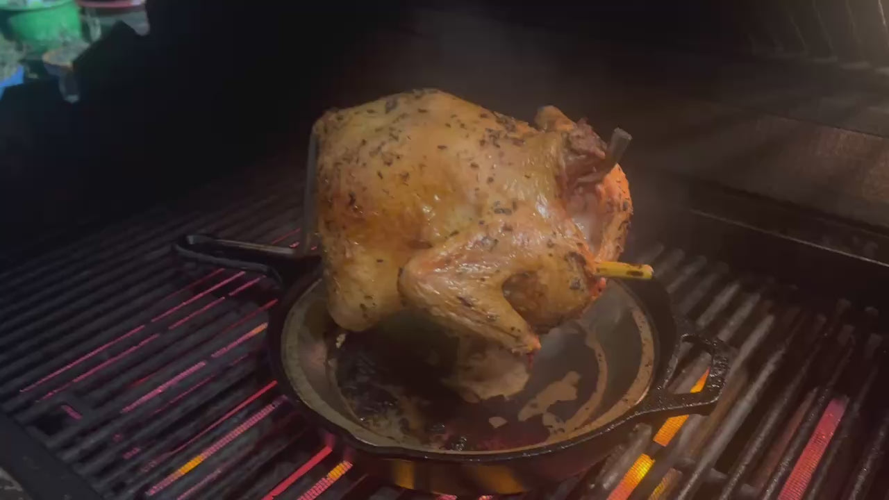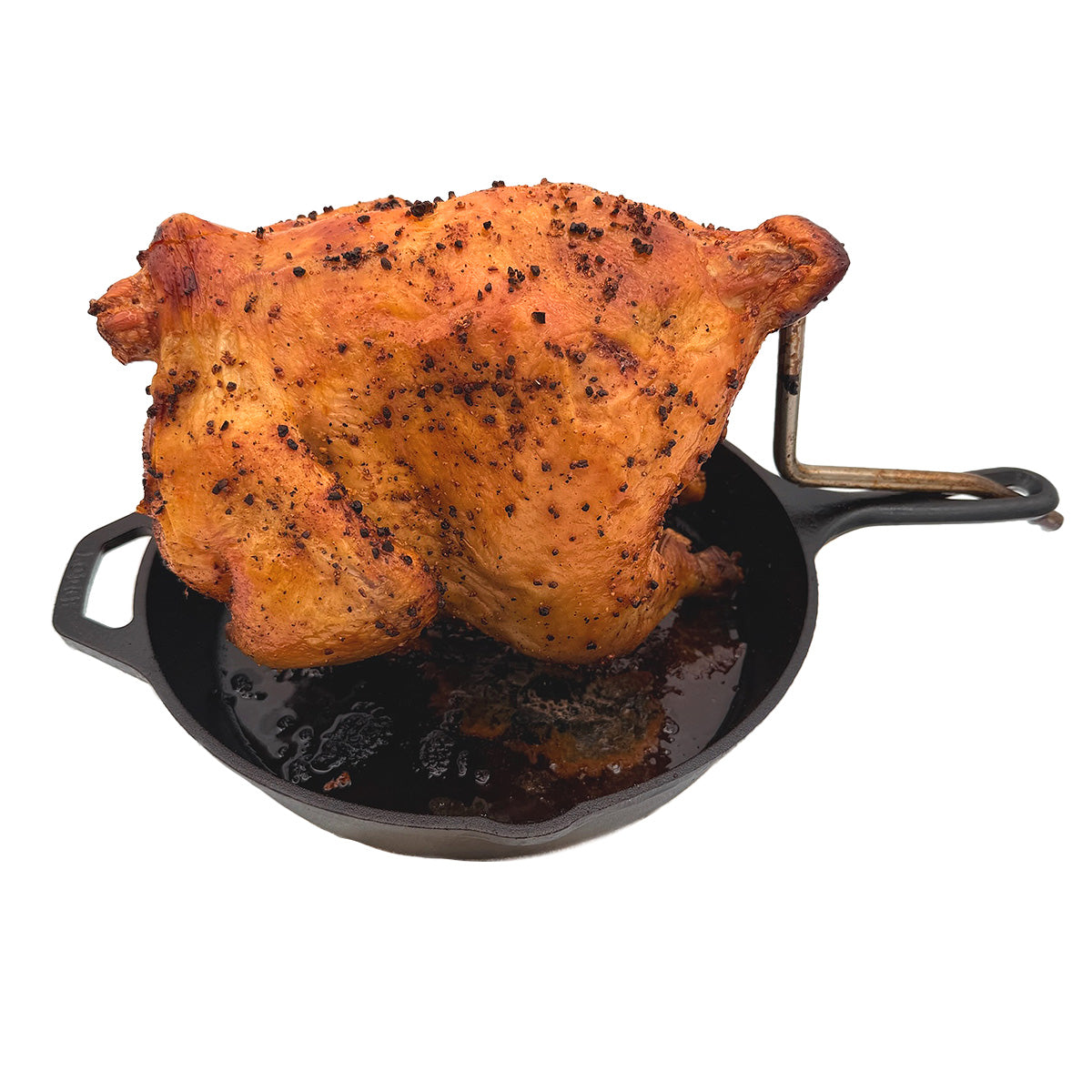 The PoulTree is a game-changer in the world of chicken cooking. Its innovative design features a marine-grade stainless steel rod that suspends the chicken horizontally inside a cast iron skillet. So instead of rotating the bird around a heat source like in rotisserie ovens, the PoulTree allows for the hot air convection currents to rotate around and through the bird similar to an air fryer. This gives your roasted chicken bold, amazing flavor and brown skin.