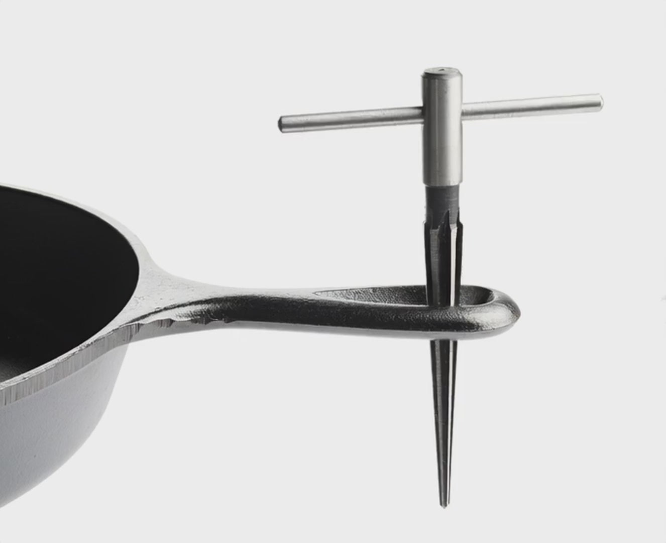 For boring your own hole in your own cast iron or similar metal skillet with a hole in the handle, choose the metal hole reamer option when adding to the cart. This tool will allow you to widen the hole on an existing iron skillet pan to fit the XL PoulTree Rod into the handle yourself as needed.